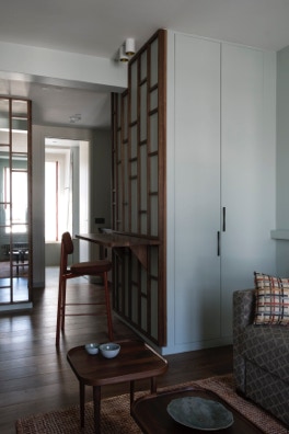 L'espace est modulable et permet, grâce à une porte à galandage, de séparer le salon de la chambre. Des jeux de miroirs dilatent l'espace.