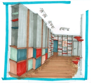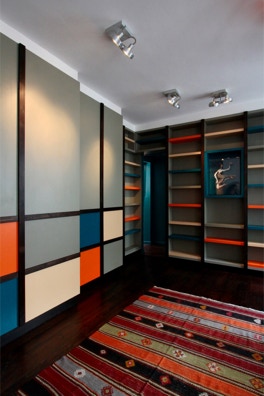 Lieu de passage dans un appartement familial qui manquait cruellement de rangement. Cette grande pièce était sans fonction propre. Elle devient un lieu à part entière rythmé par la création de placards audacieux et graphiques en hommage à Mondrian.
