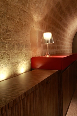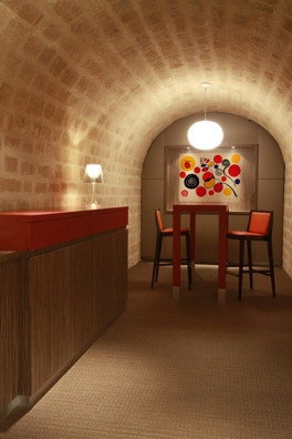L’espace convivialité implanté dans une cave voutée, mêle des rangements sur mesure en Zebrano et une accueillante table haute.