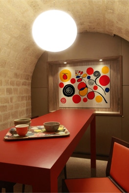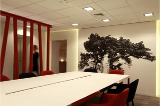 La table de la salle de réunion est isolée par un claustra stylisé qui fait écho à l’arbre décoratif qui dissimule des parois coulissantes.
