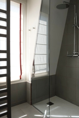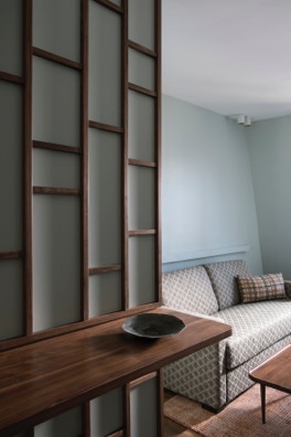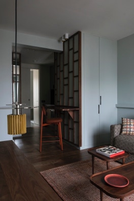 L'espace est modulable et permet, grâce à une porte à galandage, de séparer le salon de la chambre. Des jeux de miroirs dilatent l'espace.