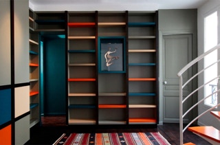 Lieu de passage dans un appartement familial qui manquait cruellement de rangement. Cette grande pièce était sans fonction propre. Elle devient un lieu à part entière rythmé par la création de placards audacieux et graphiques en hommage à Mondrian.