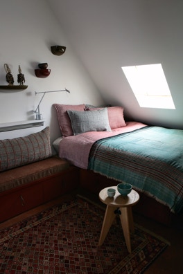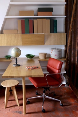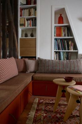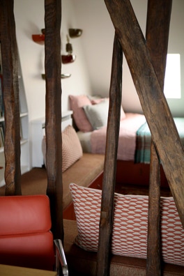 Le charme d’un appartement sous les toits presque sans cloisons. Des poutres apparentes permettent de déterminer les espaces de vie.
