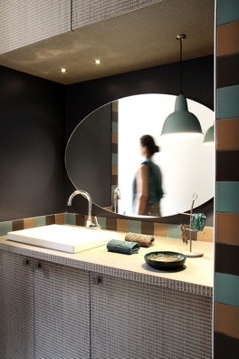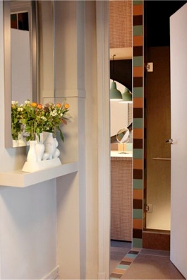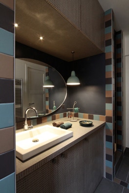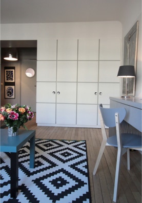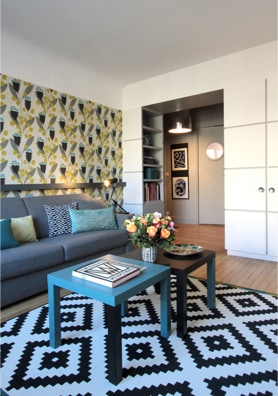 Un jeu graphique de carrés aux volumes réguliers pour dissimuler des rangements intelligents et discrets. Une ambiance chaleureuse et élégante. Le gris en fil conducteur pour valoriser les couleurs et un papier peint fleuri pour donner du style.