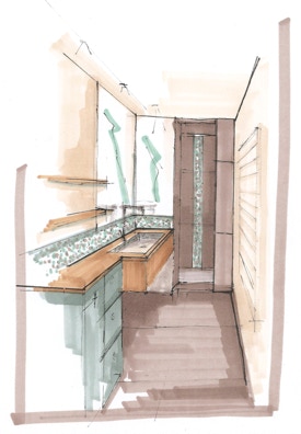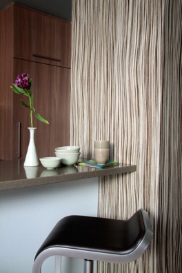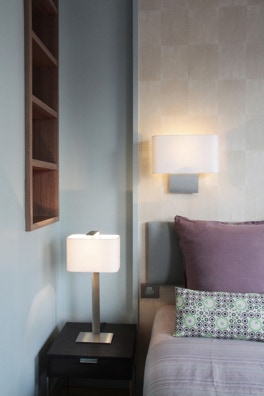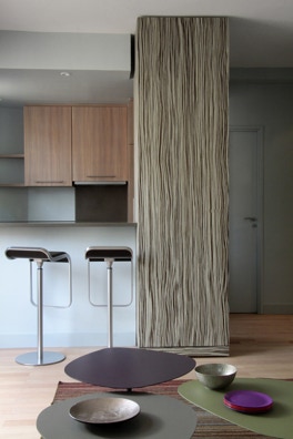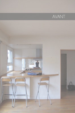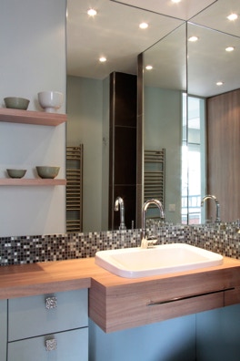 Un pied à terre raffiné aux tons doux et apaisants. Des nuances de verts délicats ponctués par des roses poudrés. Une cuisine ouverte sur le séjour articulée par une grande colonne rangements en placage de bois rayé. Une salle de douche soulignée de pâte de verre. Le mélange de la rigueur et des formes organiques.